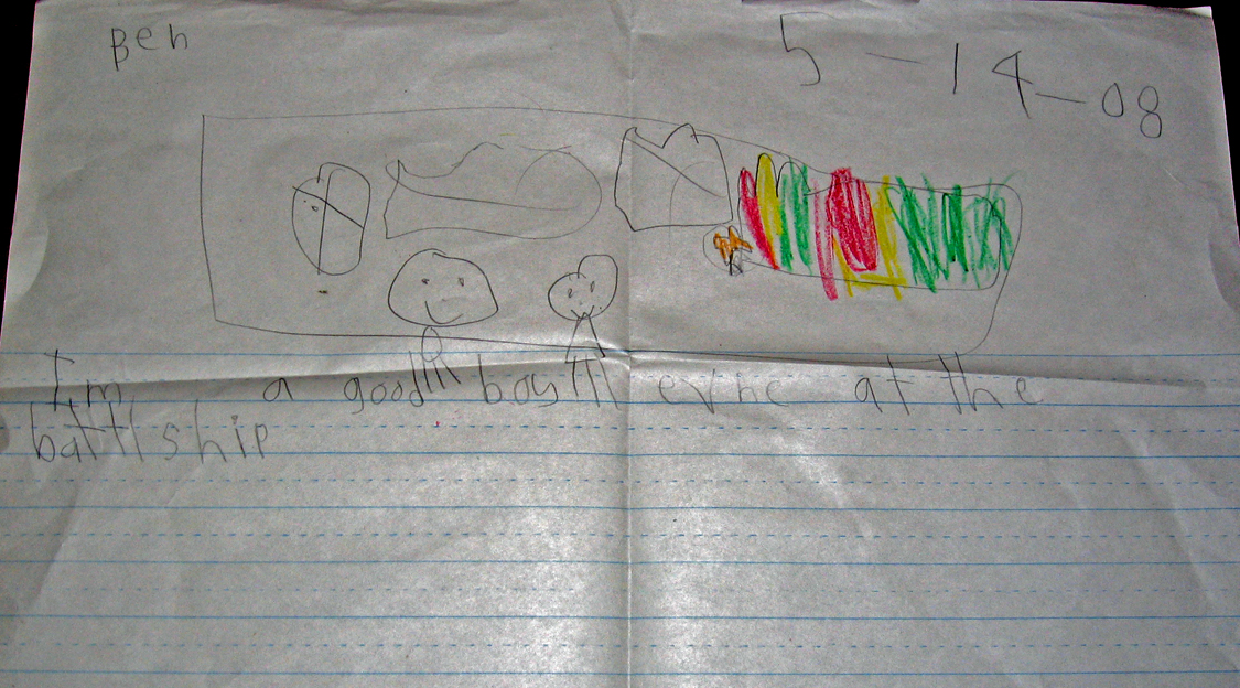 Ben drew this picture the next day, showing Ben, Daddy and (on the right) the battleship.