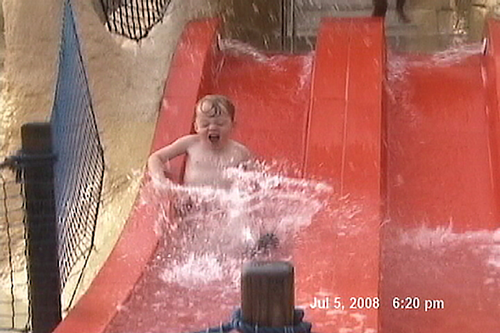 Chris having a blast on a water slide, in the Boardwalk section of the park.