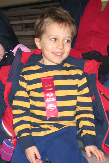 Wearing his award ribbon after the race.
